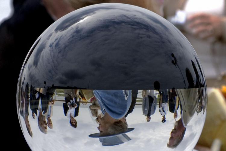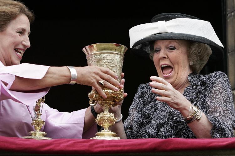 10-06-2005 - Koningin Beatrix krijgt in Veere, tijdens haar bezoek aan de provincie Zeeland, de Markizaatsbeker aangereikt door de burgemeester De Bruijn van Veere. De beker is tot de rand toe gevuld met wijn en moet eigenlijk, volgens de traditie, in een keer worden leeggedronken.