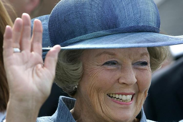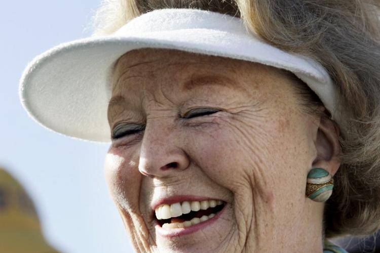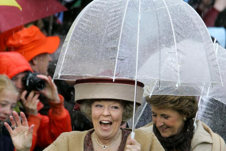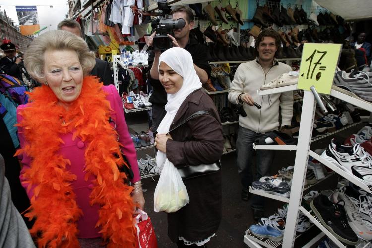 16-06-2005 - Koning Beatrix loopt met een oranje boa, die ze van een marktkoopman kreeg, over de markt in Amsterdam.