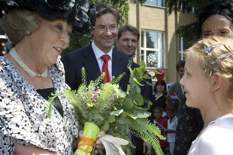23-05-2007 - Koningin Beatrix tijdens een driedaags staatsbezoek aan Slowakije. De koningin bezoekt een school waar de 10-jarige Kata haar een hand geeft.