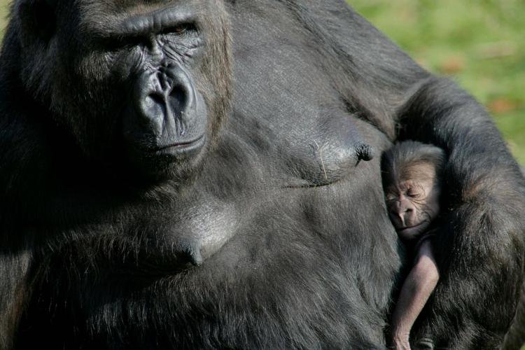 DINSDAG - Het publiek in de Apenheul in Apeldoorn weet niet wat ze ziet: Vlak voor hun ogen werd een babygorilla geboren. Moeder Mandji is met haar 32 jaar een ervaren moeder; het jong is haar achtste nakomeling.