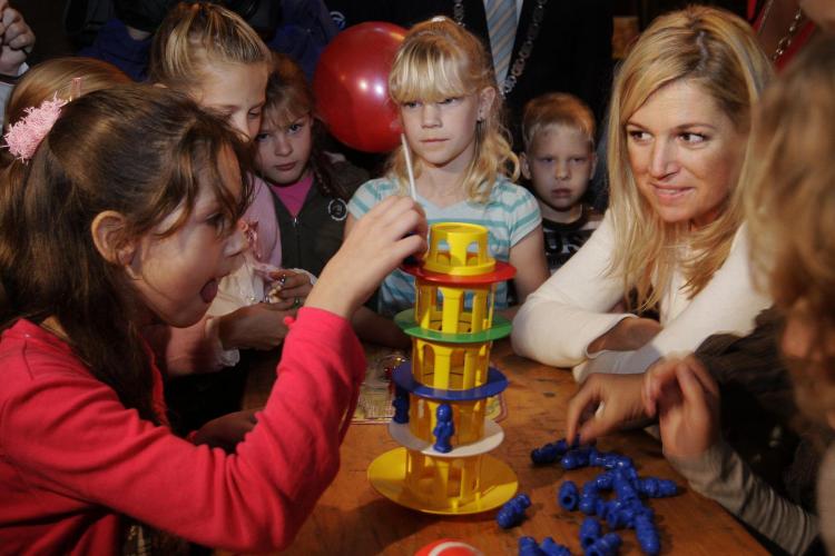 WOENSDAG - Prinses Máxima speelt een spelletje in de nieuwe Nederlandse spellenfabriek van spelletjesuitgeverij Koninklijke Jumbo, die de prinses kort daarvoor geopend heeft.