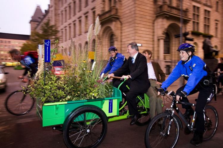 WOENSDAG – Burgemeester Opstelten van Rotterdam neemt een bakfiets met 1 vierkante meter natuur in ontvangst van Jan Jaap de Graeff, directeur Natuurmonumenten. Onder het motto ”Elke vierkante meter telt” reden bekende Nederlanders twee weken door het land met een tot natuurgebied omgebouwde bakfiets. Zij daagden inwoners en bedrijven uit om de mouwen op te stropen voor de natuur.