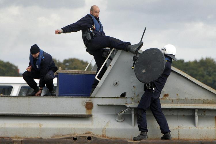 VRIJDAG - Een stevige trap moet een ME’er uit het lood brengen. Leden van de Duitse en de Nederlandse mobiele eenheid (ME) oefenen in een grindplas aan de Maas bij Cuijk. De oefening is bedoeld om elkaars methoden van aanpak te leren kennen en op elkaar af te stemmen.
