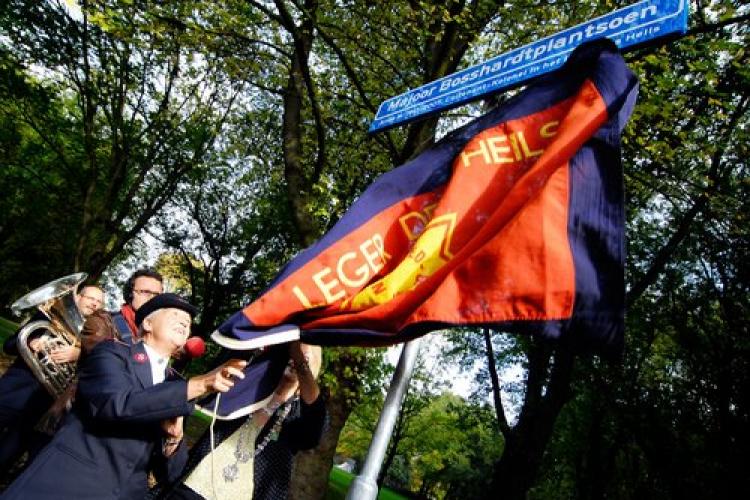 VRIJDAG - Utrecht heeft, als eerste stad in Nederland, een plantsoen dat vernoemd is naar majoor Bosshardt. Burgemeester Brouwer Korf (onder de vlag) onthult het bord. Bosshardt werkte ruim veertig jaar voor het Leger des Heils tussen prostituees, criminelen, verslaafden en daklozen.