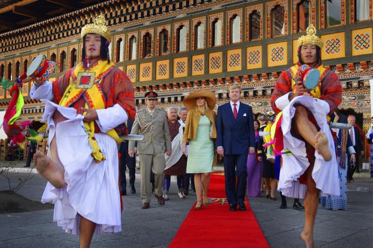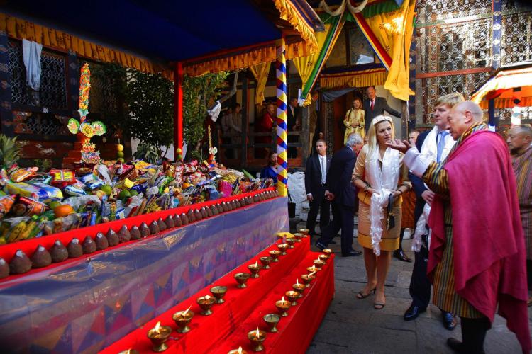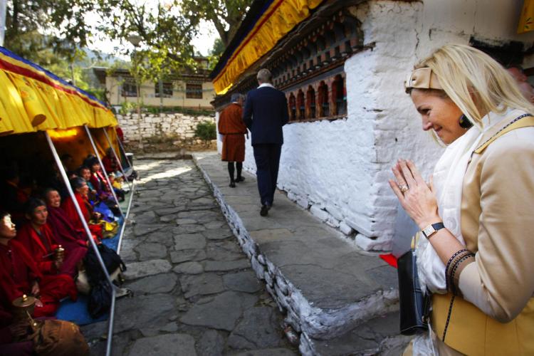 Prins Willem-Alexander en prinses Máxima bezoeken de Tempel Kyichu Lhakhang. Driekwart van de bevolking in Bhutan is Boeddhist, een kwart Hindoe.