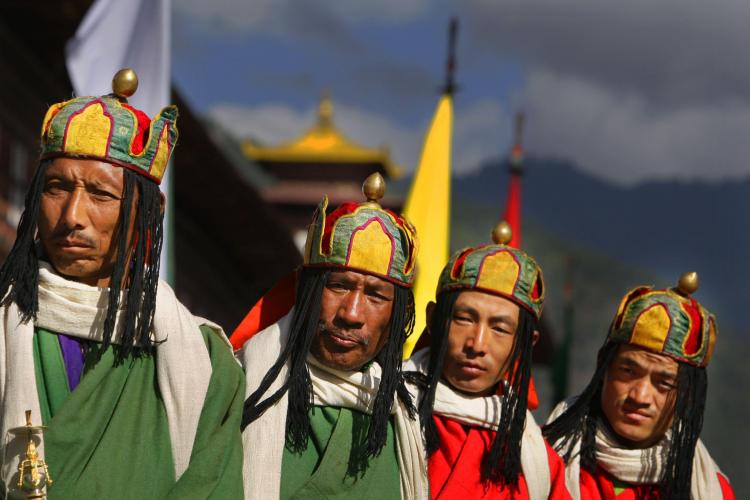 Op weg naar de koning van Bhutan wordt het paar begeleid door een processie.