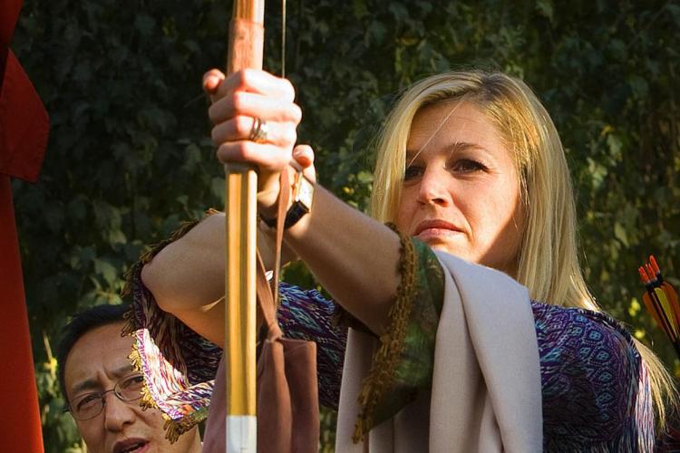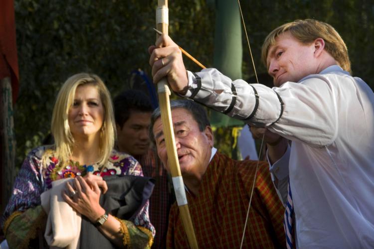 Prins Willem-Alexander is aan het boogschieten en prinses Máxima kijkt toe. De prins reageert blij na een goed schot.
