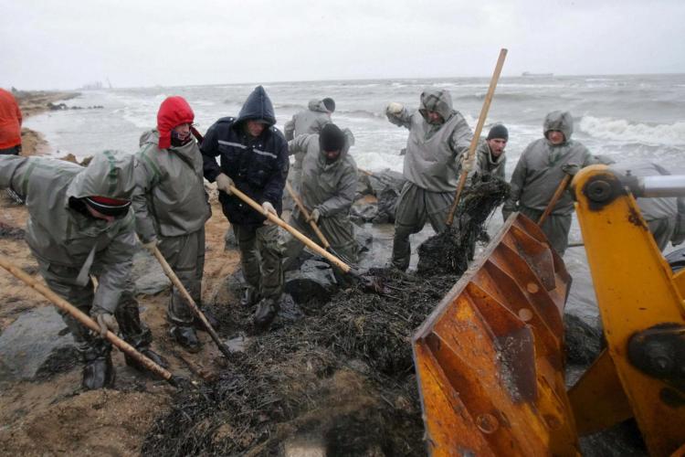 MAANDAG - Rusland heeft 500 militairen ingezet voor het opruimen van de 2000 ton stookolie die in de Zwarte Zee is gestroomd. Nog zeker 10.000 ton olieachtige smurrie moet opgeruimd worden. Bij de olieramp zijn zeker 30.000 vogels en 9000 vissen bezweken. - Foto's ANP/EPA/RD