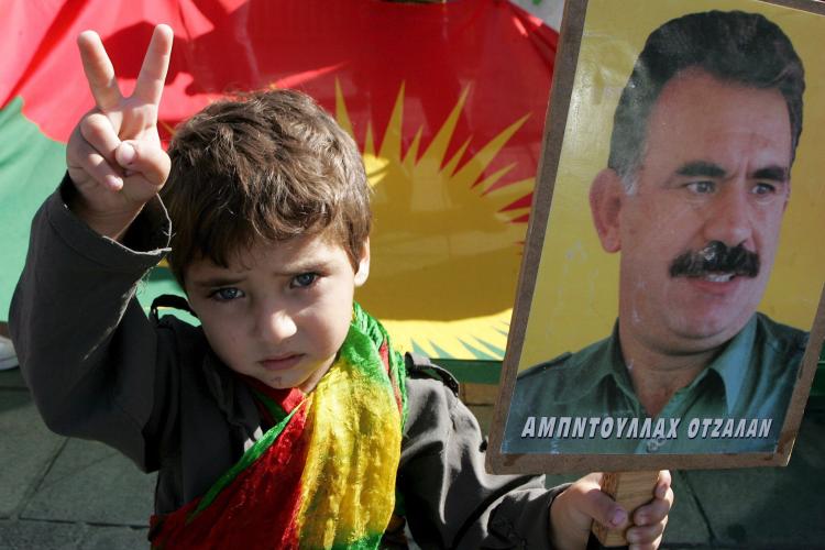 DINSDAG – Een Koerdische jongen houdt een poster vast van PKK leider Abdullah Öcalan tijdens een demonstratie van Koerden op het eiland Cyprus. Hiermee protesteren de Koerden tegen een mogelijke inval van het Turkse leger in Noord Irak.