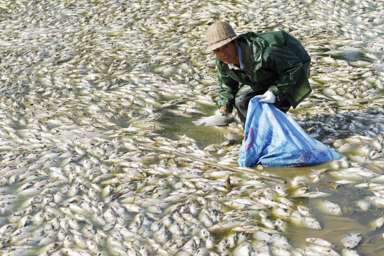DINSDAG – Een Chinese arbeider verzamelt dode vissen uit een visvijver in het Chinese Xindian. Meer dan 300.000 kilo vis stierf de afgelopen dagen doordat een onbekende gif in het water had gedumpt.