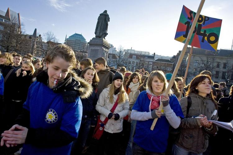 WOENSDAG – Ruim 400 scholieren demonstreren in Den Haag tegen de verplichte 1040 lesuren per jaar. Veel middelbare scholen halen deze norm niet en worden hiervoor door de onderwijsinspectie op de vingers getikt. De demonstratie was een initiatief van scholierenorganisatie LAKS.