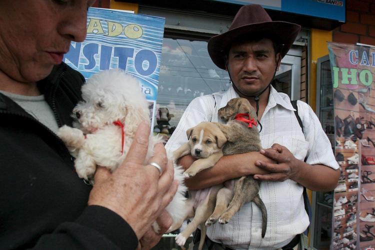 VRIJDAG – Een man verkoopt zijn puppy’s in het centrum van Cuenca in Ecuador. In de grote steden van het land schraapt zo’n 57 procent van de werkenden zijn kostje bij elkaar zonder bij een baas in dienst te zijn.