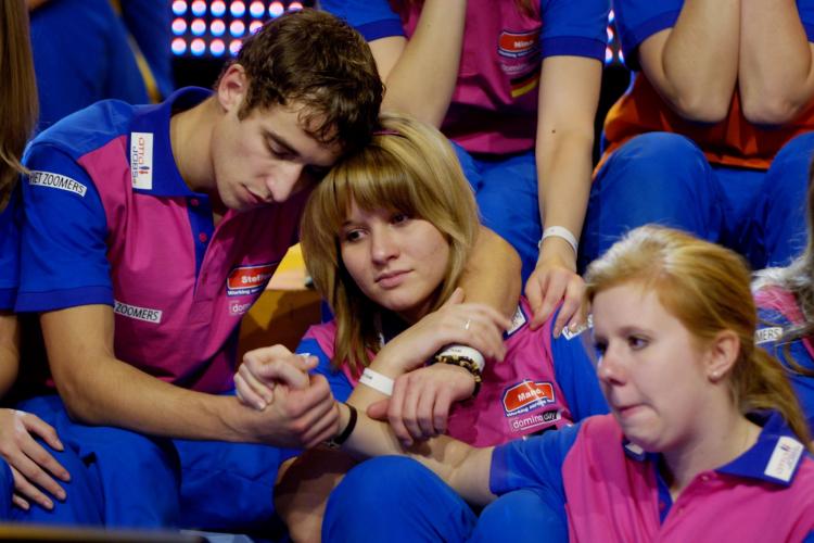 ZATERDAG - Teleurstelling onder de deelnemers van Domino D Day. Ze zijn er niet in geslaagd het wereldrecord vallende dominostenen te breken. Er vielen ‘slechts’ 3.671.456 van de 4,5 miljoen opgestelde stenen om.