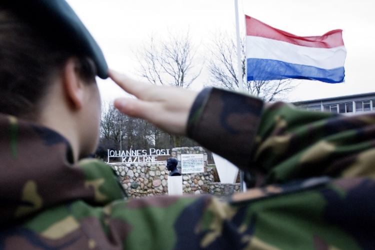 MAANDAG - Een militair salueert voor de vlag die bij de Johannes Postkazerne in het Drentse Havelte halfstok hangt. Een 20-jarige soldaat en een 22-jarige korporaal van het 44e Pantserinfanteriebataljon uit Havelte zijn in Afghanistan door eigen vuur om het leven gekomen. - Foto's ANP/EPA/RD