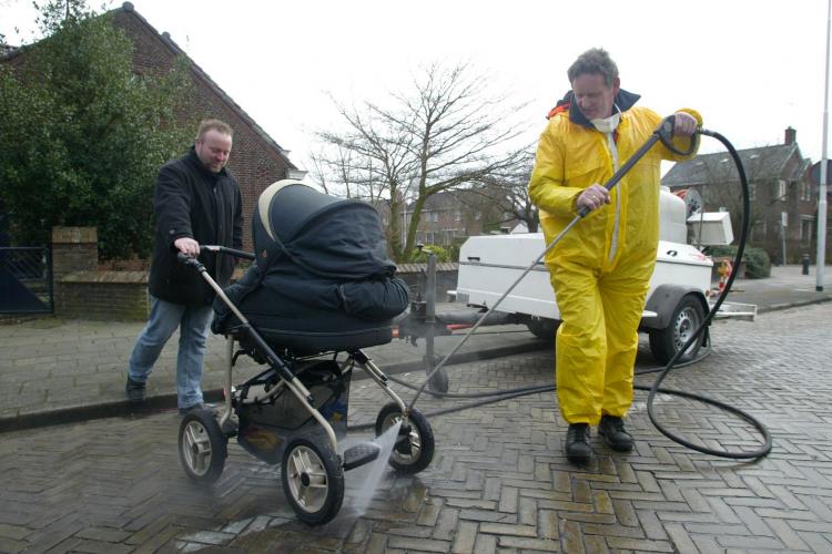 MAANDAG - Zelfs kinderwagens krijgen een beurt nadat bij een brand in het Overijsselse Vroomshoop asbest is vrijgekomen.