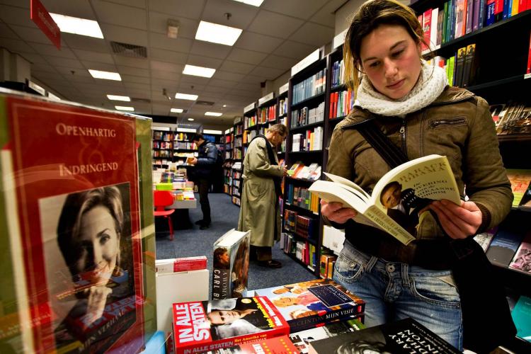 DINSDAG - Een klant van boekhandel Broese in Utrecht bekijkt het aanbod van boeken over de verkiezingen in de Verenigde Staten. Met het inrichten van speciale hoekjes met boeken over dit onderwerp speelt de boekenbranche in op de huidige publiciteit rondom de eerste voorverkiezingen in Amerika.