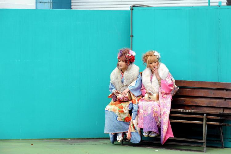 WOENSDAG - Twee 20-jarige Japanse jongedames pauzeren even tijdens een ceremonie ter ere van hun volwassenheid in het Toshimaenpark in Tokio. Pas vanaf de ”Dag van het op leeftijd komen”, de 20e verjaardag, mogen Japanners stemmen en ook drinken en roken. Trouwen is al wel eerder mogelijk, voor meisjes vanaf 16 jaar en voor jongens vanaf 18. Uit onderzoek van de Nihonuniversiteit in Tokio blijkt dat de Japanse jeugd steeds afhankelijker is van de mobiele telefoon. Experts zeggen dat tieners steeds minder goed kunnen omgaan met mensen. „Ze voelen zich onzeker zonder mobiele telefoon”, aldus socioloog Nihon Nakagawa.