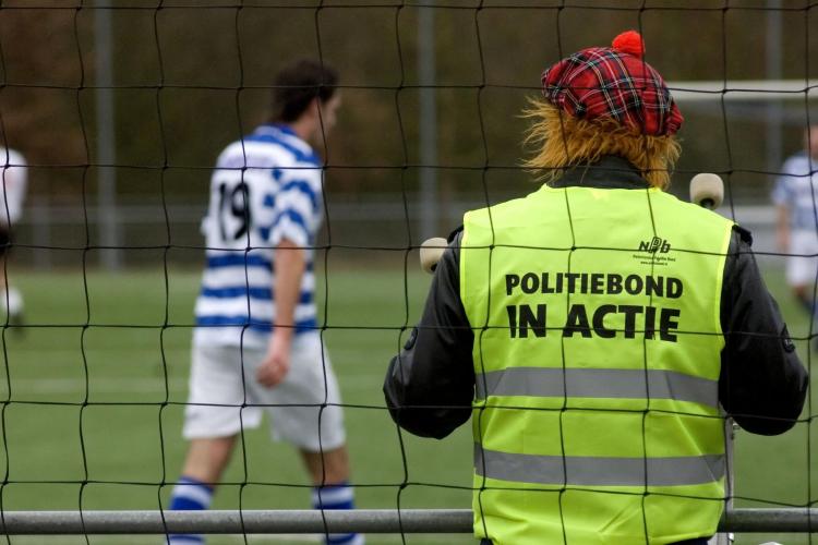 WOENSDAG - Actievoerende agenten van het korps Noord- en Oost-Gelderland spelen in Doetinchem een vriendschappelijke wedstrijd tegen de plaatselijke voetbalclub. Het duel was als knipoog bedoeld naar voorzitter Kessler van de voetbalbond. Die noemde de stakende politiemensen onlangs „verwende kereltjes.”