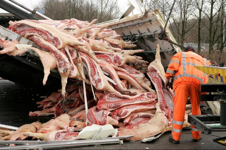 DONDERDAG - Bij de oprit van de N281 vlak bij het stadion van Roda JC in Kerkrade is een vrachtwagen geladen met ruim 700 halve varkens door zijn as gezakt. Een deel van de lading kwam op het wegdek terecht. Het opruimen van het vlees nam uren in beslag, aldus de politie. Een deel van de weg werd afgezet. Niemand raakte gewond.