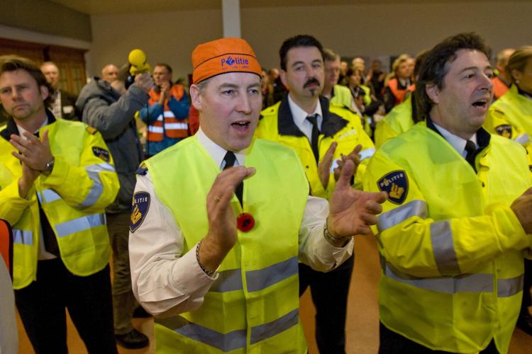 VRIJDAG - Stakende politiemensen in Driebergen. De politiebonden gaan om tafel met minister Ter Horst over het cao conflict. De reformatorische vakorganisatie RMU heeft de vakbonden opgeroepen „daadwerkelijk te onderhandelen” met de minister. De RMU vindt dat politiemensen een „zwakke inkomenspositie” hebben.