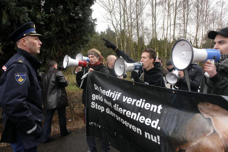 ZATERDAG Dierenactivisten van de Anti Dierproeven Coalitie houden een demonstratie bij het bedrijf Harlan in het Limburgse Horst. Bij het bedrijf worden dieren gekweekt die onder meer worden gebruikt voor dierproeven. De activisten willen dat er aan deze praktijk een einde wordt gemaakt. Bij de demonstratie werd een 22 jarige man uit Vught gearresteerd. Hij bevond zich buiten het gebied waar mocht worden gedemonstreerd.