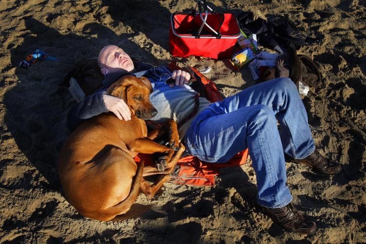 MAANDAG - Heerlijk lenteweer. Man en hond genieten maandag op het strand van de zon. - Foto's ANP/EPA/RD