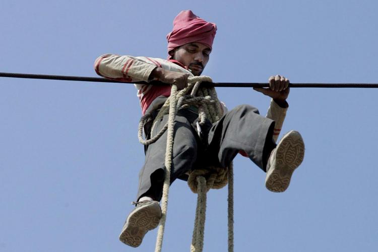 Een gevaarlijk karwei. Een Indiër voert onderhoudswerkzaamheden uit aan elektriciteitskabels. Het stroomgebruik in Gurgaon, een voorstad van New Delhi is explosief toegenomen door de enorme economische groei aldaar.