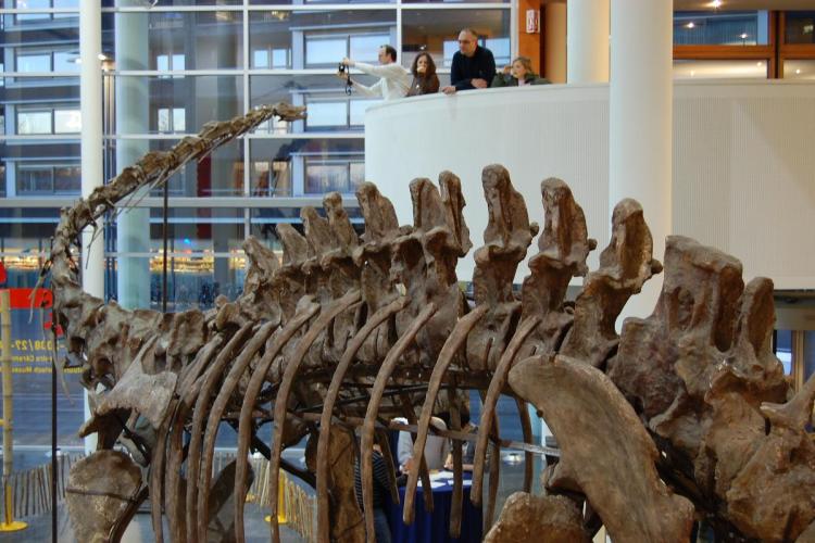 Dit 26 meter lange skelet van de Mamenchisaurus is een van de vier reusachtige dinosaurusskeletten uit China die tot 27 april staat tentoongesteld in het Centre Céramique in Maastricht.