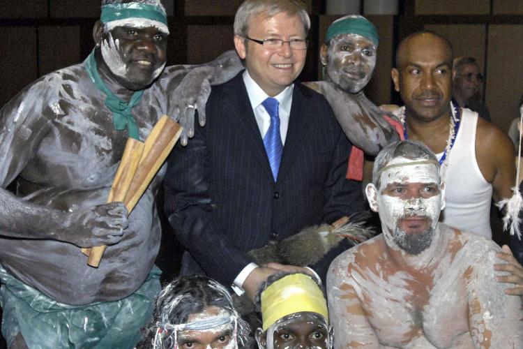 Aboriginals -inboorlingen- met premier Kevin Rudd van Australië. Het land heeft woensdag excuses aangeboden voor „het grote verdriet, leed en verlies”dat de oorspronkelijke bewoners door de verschillende regeringen is aangedaan.