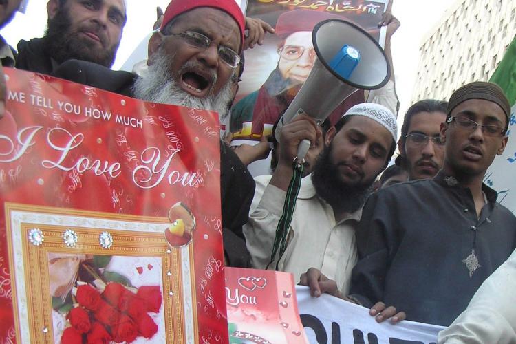 VRIJDAG - Niet overal wordt zo te zien Valentijnsdag gevierd. In Pakistan staken aanhangers van de fundamentalistische JUP partij valentijnskaarten in brand. Ze vinden viering van Valentijnsdag in strijd met de islam.