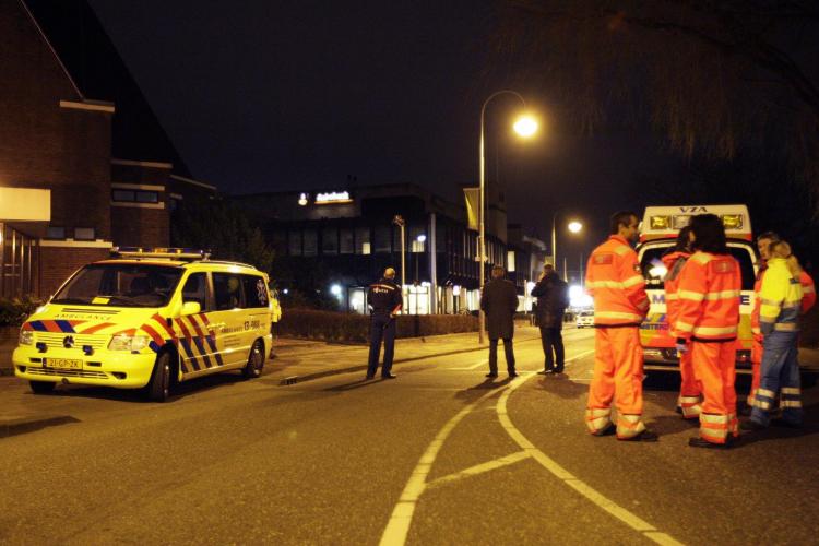 Politieagenten met kogelvrije vesten en hulpverleners bij het kantoor van de Rabobank in Hoofddorp waar een gewapende overval plaatshad. Een medewerker van de bank raakte gewond.