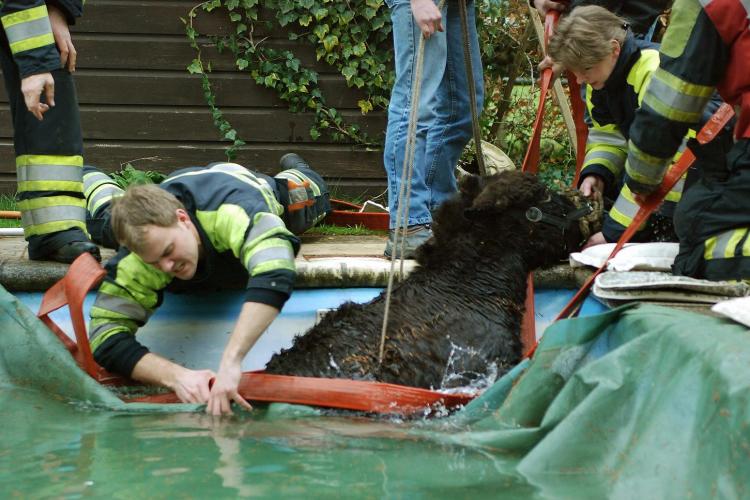 Maandag – Het zal je maar gebeuren. Je bent vrolijk aan het wandelen in het vroege voorjaar. Plons… Dat overkwam deze ezel in Driebergen. Brandweerlieden moesten de ongelukkige, losgebroken ezel weer op het droge helpen. - Foto's ANP/EPA/Frank van Rossum/VidiPhoto