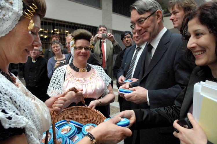 Woensdag – Een groep Zeeuwen vraagt aandacht voor de ziekenhuiszorg op Walcheren. Ze bieden SGP fractievoorzitter Van der Vlies Zeeuwse babbelaars aan.