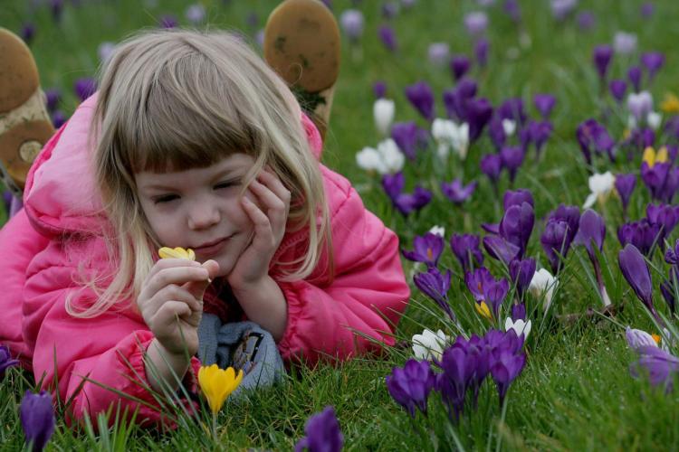 Vrijdag – Door het zachte winterweer bloeien overal krokussen. Kinderen voelen zich in het Betuwse Elst aangetrokken tot de bloeiende bloemen.