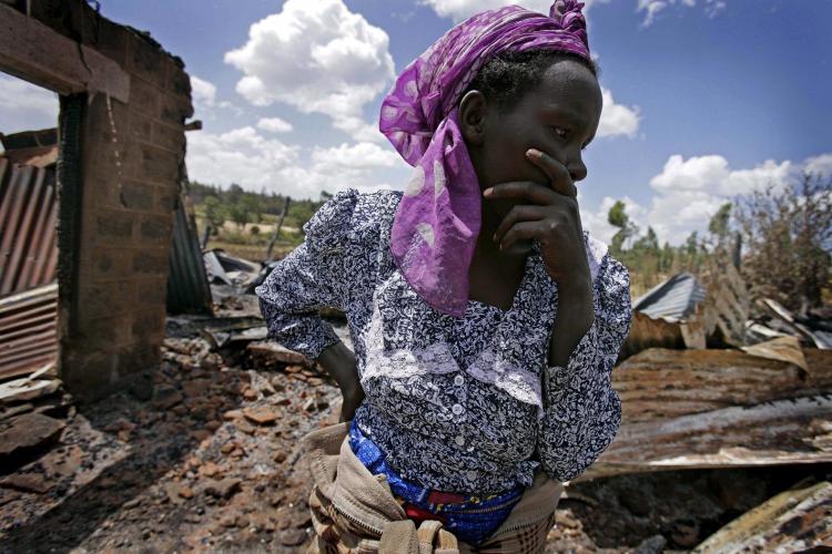 Zaterdag – Een Keniase vrouw bekijkt de resten van haar huis. Sinds de jaarwisseling is Kenia het toneel van heftig geweld tussen bevolkingsgroepen naar aanleiding van de verkiezingen op 27 december. Vanwege aanhoudend geweld keren duizenden vluchtelingen nog niet terug.