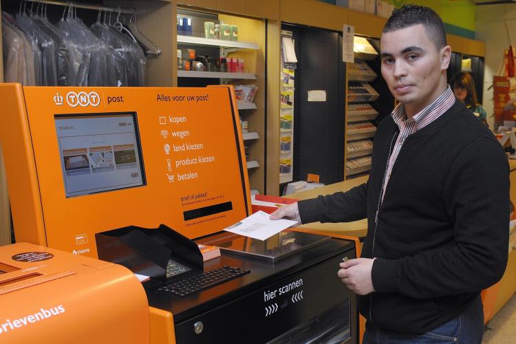 Zaterdag – In een supermarkt in Breda staat een proefopstelling van een zelfbedieningsautomaat van TNT Post. Hier kunnen klanten onder meer brieven wegen, postzegels kopen, post frankeren, pakketjes scannen om ze vervolgens met pin en chipknip te betalen.