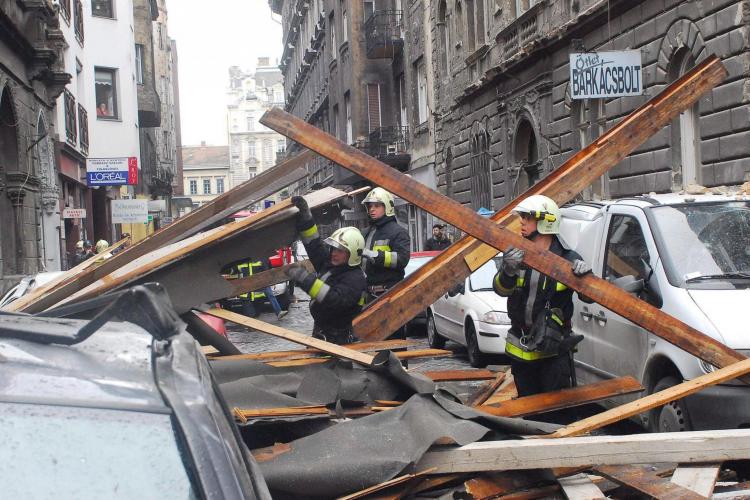 MAANDAG – In de Hongaarse hoofdstad Boedapest verwijderen brandweerlieden de resten van een dak dat als gevolg van de hevige wind naar beneden kwam. Er kwamen zeker acht mensen om het leven door de storm die over Europa trok. - Foto's EPA/Dick Vos/ANP/RD/VidiPhoto