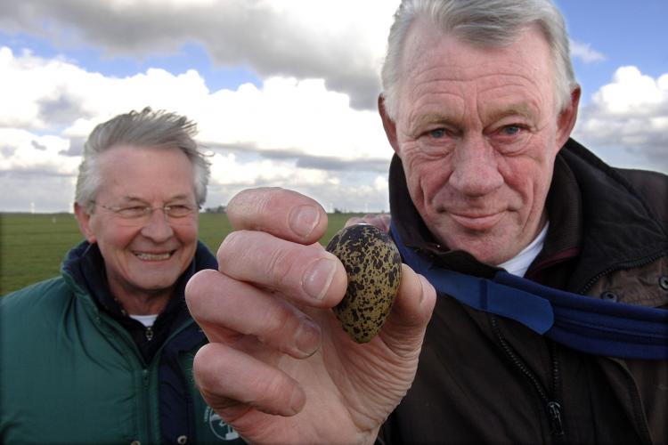 DINSDAG – Hayo Piersma (r.) toont het eerste kievitsei van 2008. Hij vond het ei samen met Gert Bieshaar in de Maatpolder bij het Utrechtse Eemnes. Twee jaar geleden vonden de twee ook al het eerste kievitsei.