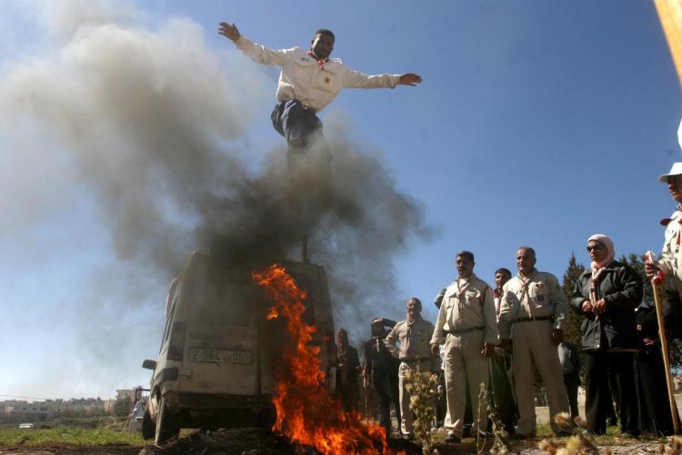 WOENSDAG – Palestijnse padvinders op de Westelijke Jordaanoever oefenen hoe je zonder kleerscheuren over vuur kunt springen. Op de Gazastrook hadden de Palestijnen te maken met een Israëlische inval.