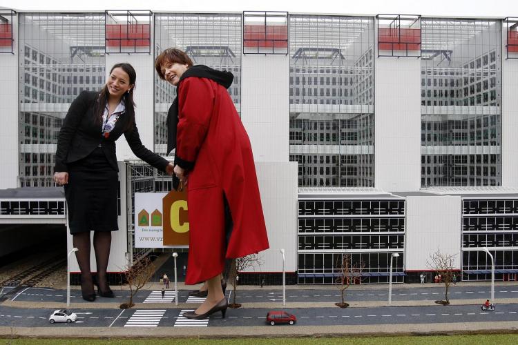 VRIJDAG – Minister Vogelaar voor Wonen, Wijken en Integratie onthulde samen met de burgemeester van Madurodam (l.) een maquette van het VROM-gebouw in Madurodam in Den Haag.