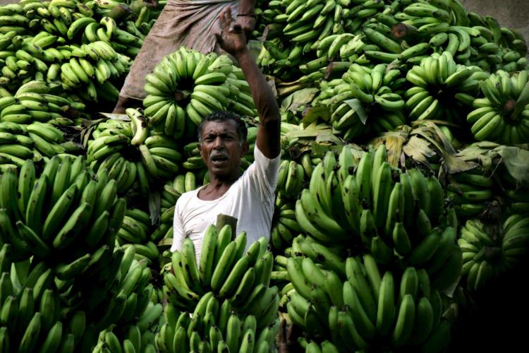 ZATERDAG – Een verkoper probeert zijn waar aan de man te brengen op een fruitmarkt in de Indiase stad Calcutta. Vanuit verschillende delen van het land wordt het fruit aangevoerd. India kent alleen al 200 verschillende soorten bananen.
