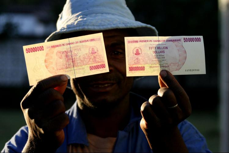 MAANDAG De Zimbabwanen kunnen sinds kort met bankbiljetten van 50 miljoen Zimbabwaanse dollars betalen. Het nieuwe geld is uitgegeven vanwege de snelgroeiende tekorten in het land. Het geld is er bijna niets meer waard.