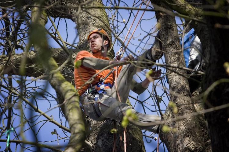 DINSDAG Een boomwerker maakt de takken van de Anne Frankboom in Amsterdam vast met touwen. Dit om te voorkomen dat bij storm de takken afbreken en schade veroorzaken.