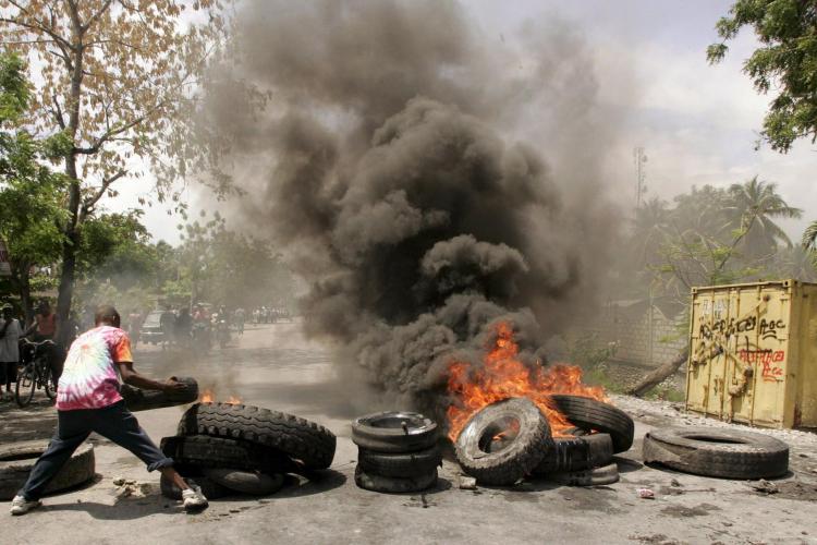 WOENSDAG Een Haοtiaan blokkeert uit protest tegen de hoge voedselprijzen een straat in Les Cayes. Stijgende voedselprijzen veroorzaken onrust in de hele wereld, maar komen vooral in het straatarme Haοti hard aan.