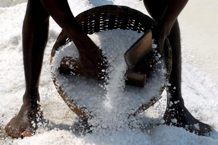 DONDERDAG In zoutpannen bij de Indiase stad Bombay is men deze dagen druk met de eerste zoutwinning van het jaar. Door hevige regenval en een vrij lange winter is de productie met ongeveer 14 procent teruggelopen. Naar schatting 150.000 mensen werken gedurende acht maanden per jaar in de zoutpannen.