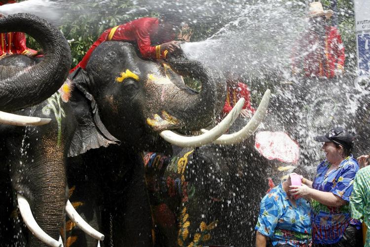 VRIJDAG Thaise olifanten besproeien westerse toeristen bij de viering van het traditionele Thaise nieuwjaar.