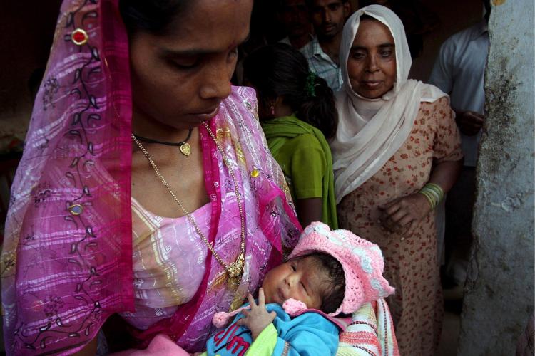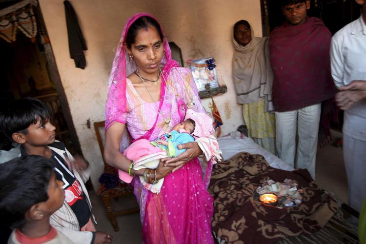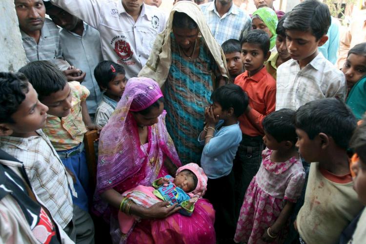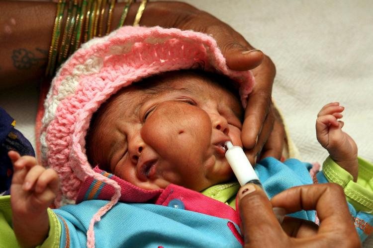 NEW DELHI - Foto's van de in Noord-India geboren baby met twee gezichten. Het meisje heeft twee neuzen, twee monden waarmee ze kan drinken en vier ogen die ze tegelijk kan sluiten. De een maand oude Lali wordt door de plaatselijke bevolking vereerd als een reïncarnatie van een hindoe-godin. - Foto's EPA