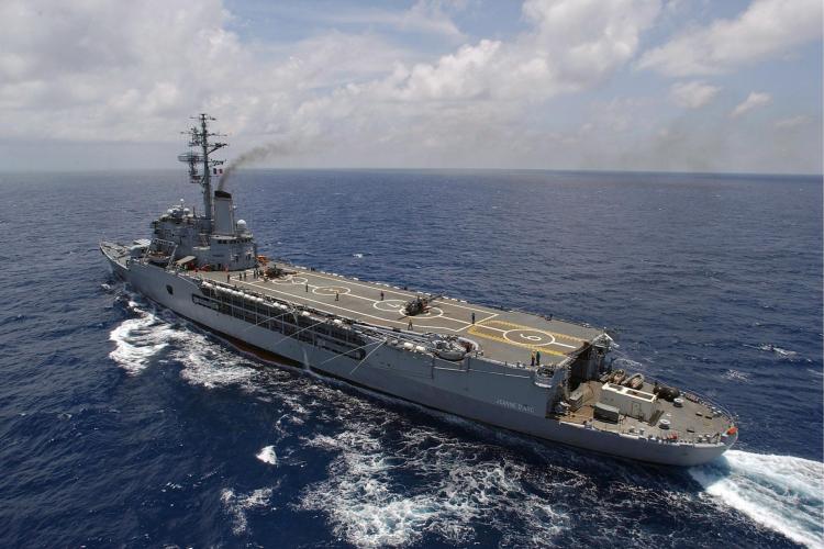 Het Franse helikoptervliegdekschip Jeanne D'Arc, vrijdag in actie tijdens de vrijlating van de gijzelaars.