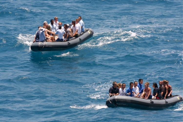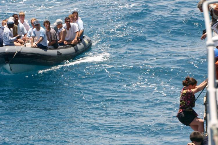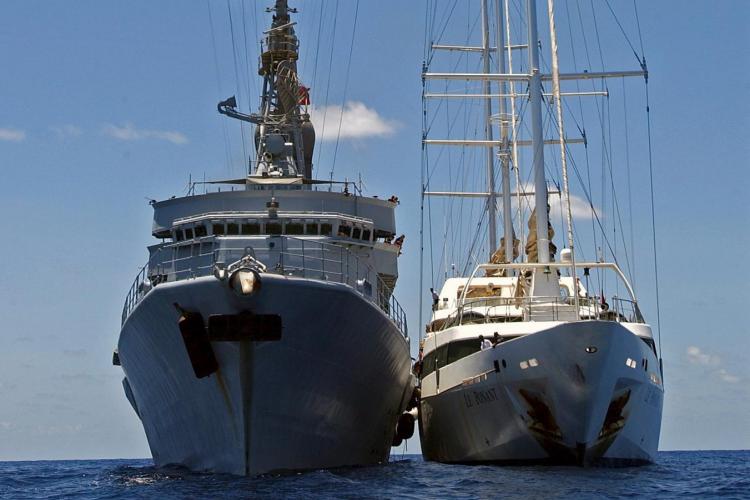 Een bemanningslid van Le Ponant klimt aan boord van het Franse marinefregat Jean Bart.