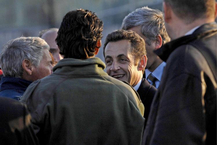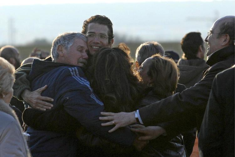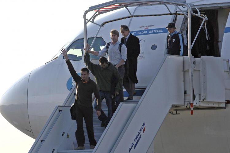 De Franse president Nicolas Sarkozy verwelkomt de vrijgelaten gijzelaars.